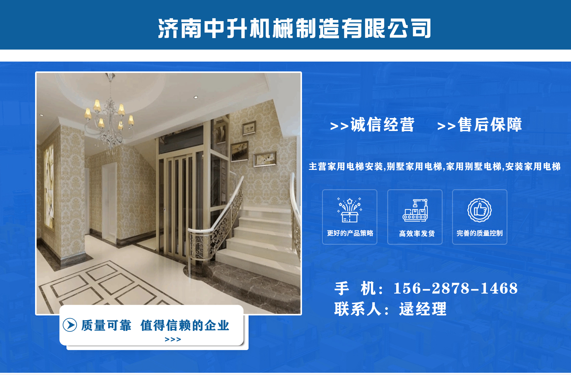 濟(jì)南中升機(jī)械制造有限公司主營家用電梯安裝,別墅家用電梯,家用別墅電梯,安裝家用電梯等業(yè)務(wù),質(zhì)量可靠,值得信賴! 公司為客戶提供免費(fèi)上門測量,根據(jù)實(shí)際情況1對(duì)1服務(wù),保障符合用戶需求,終身提供售后服務(wù),讓用戶買的舒心用的放心。匠心團(tuán)隊(duì),打造信賴產(chǎn)品,我們有團(tuán)結(jié)、奮進(jìn)拼搏的匠心團(tuán)隊(duì),為您提供可信賴的品質(zhì)保證。 從創(chuàng)立以來一直嚴(yán)格執(zhí)行質(zhì)量管理體系、環(huán)境管理體系等相關(guān)標(biāo)準(zhǔn)管理體系,“顧客滿意”是我們始終如一的追求。我們有屬于自己培養(yǎng)的安裝隊(duì)伍,24小時(shí)服務(wù)電話,為您提供可靠的服務(wù)與支持。 我們的愿景是建設(shè)國內(nèi)具有影響力的電梯公司,做城市美好空間的好伙伴。...